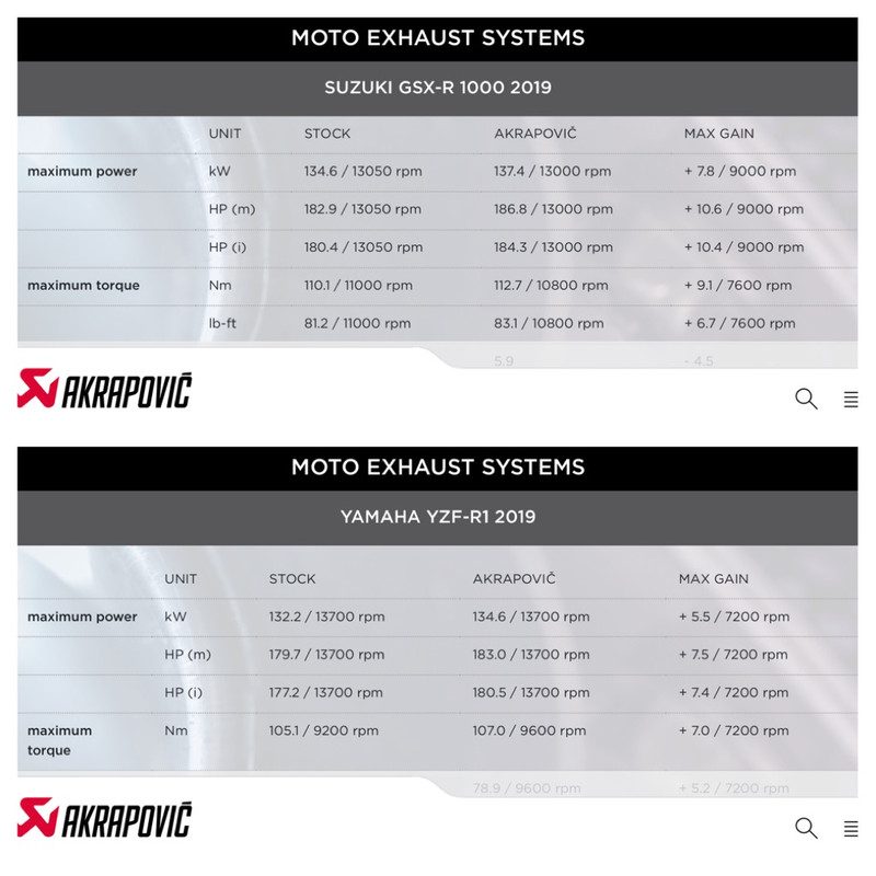 Quando leggete di un incremento di cavalli con scarico completo, ecu e filtro, parlano di cavalli guadagnati sul punto pi? forte del motore. Quelli a fondo scalo saranno sempre inferiori e ?inutili?, retando nel discorso Yamaha e Suzuki. Per quanto riguarda Ducati, qualcuno crede ancora che, quella moto abbia 214 cavalli, 226 con akrapovic. Avere una curva di erogazione penosa, con la moto che si muove tanto, non significa di avere pi? cavalli di altre moto che stendono meglio, e non si muovono.