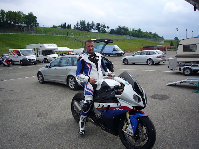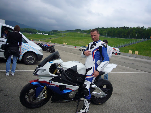 Io non ho girato tantissimo, giusto il tempo di farmi un paio di video da Alessandro Torcolacci e fare due foto della moto. Uno del nostro gruppo mi fa: "aspetta che ho preso la tuta nuova, ti piaccioni i colori?....appena l'ho visto gli ho fatto fare subito il modello