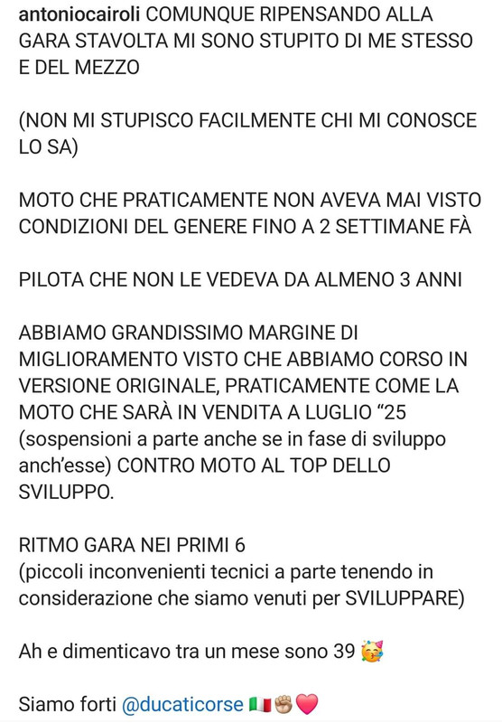 L'intento era sicuramente fare esperienza a 360°, se sui vari social FB e Instagram seguite i 2 piloti Lupino e Tony noterete che praticamente fanno test tutte le settimane,, in svariate piste e contesti, quindi questa esperienza serviva per confrontarsi e accumulare dati e soprattutto elementi in piu per capire il livello di Ducati e degli altri.