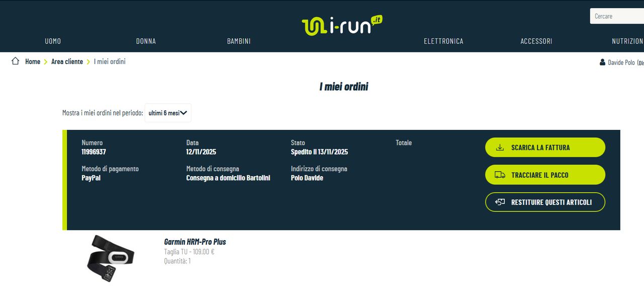 Il 12 novembre ordino su I-Run.it una fascia cardiaca della garmin, spediscono il 13 (in teoria un paio di giorni e mi arriva) ovviamente com e tutto online pago in anticipo.