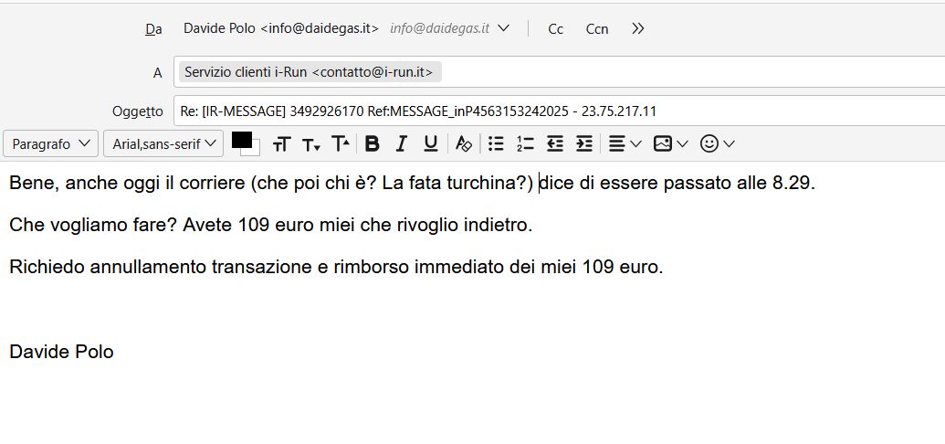 Da ieri hanno smesso di rispondere (ho mandato due email aggiornando la situazione e chiedendo annullamento e RIMBORSO IMMEDIATO) e io mi sto incazzando.... Come la vedete?