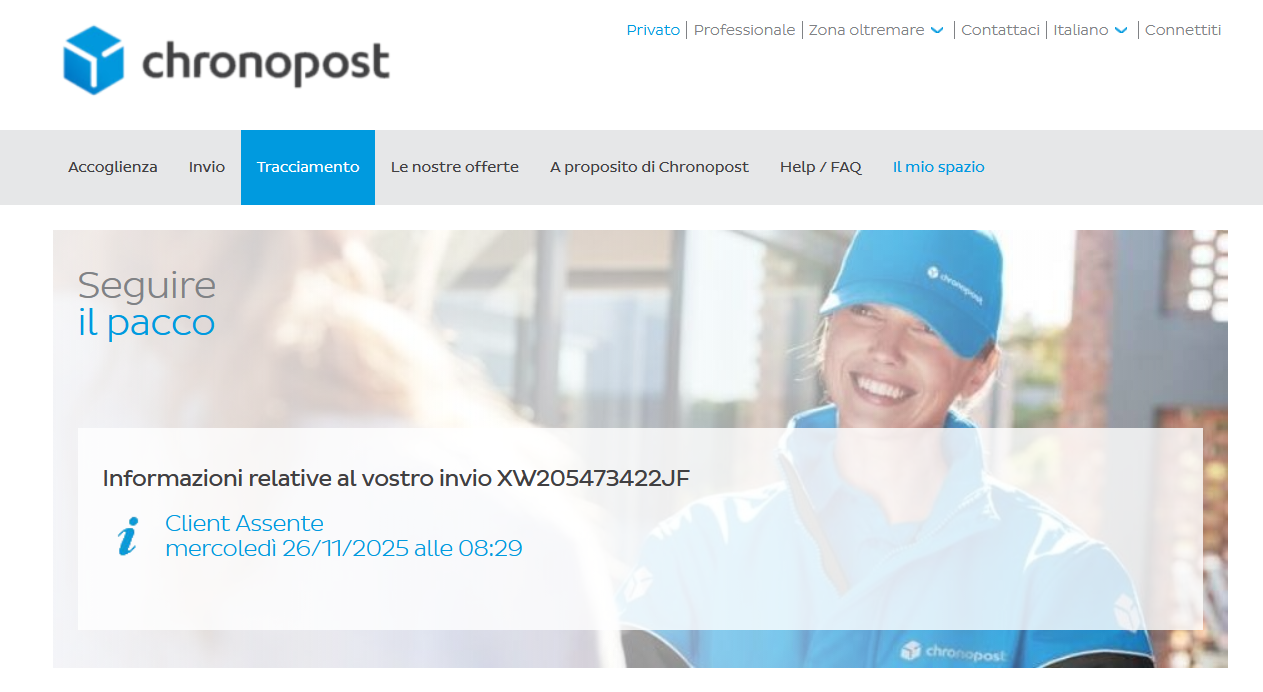 25-11 ore 10 (si sempre le 10, che puntualità manco in giappone) : Cliente assente (stavo in casa, nessuno suona ,nessuno chiama, nessuno telefona)