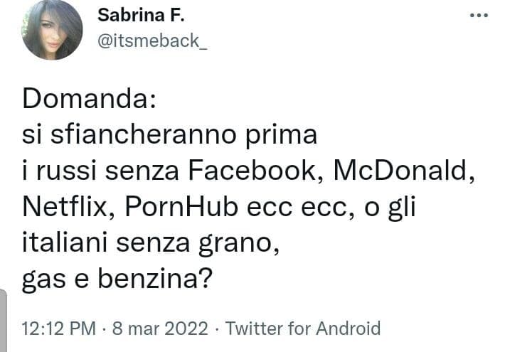 e quando il gioco si fa duro Andy parte con i neme no sense, forse sabrina F. é troppo stupida per capire le ripercussioni economiche che stanno portando le sanzioni occidentali e si limita a riportare le uniche cose che comprende, cioè marchi di cui evidentemente fa buon uso.