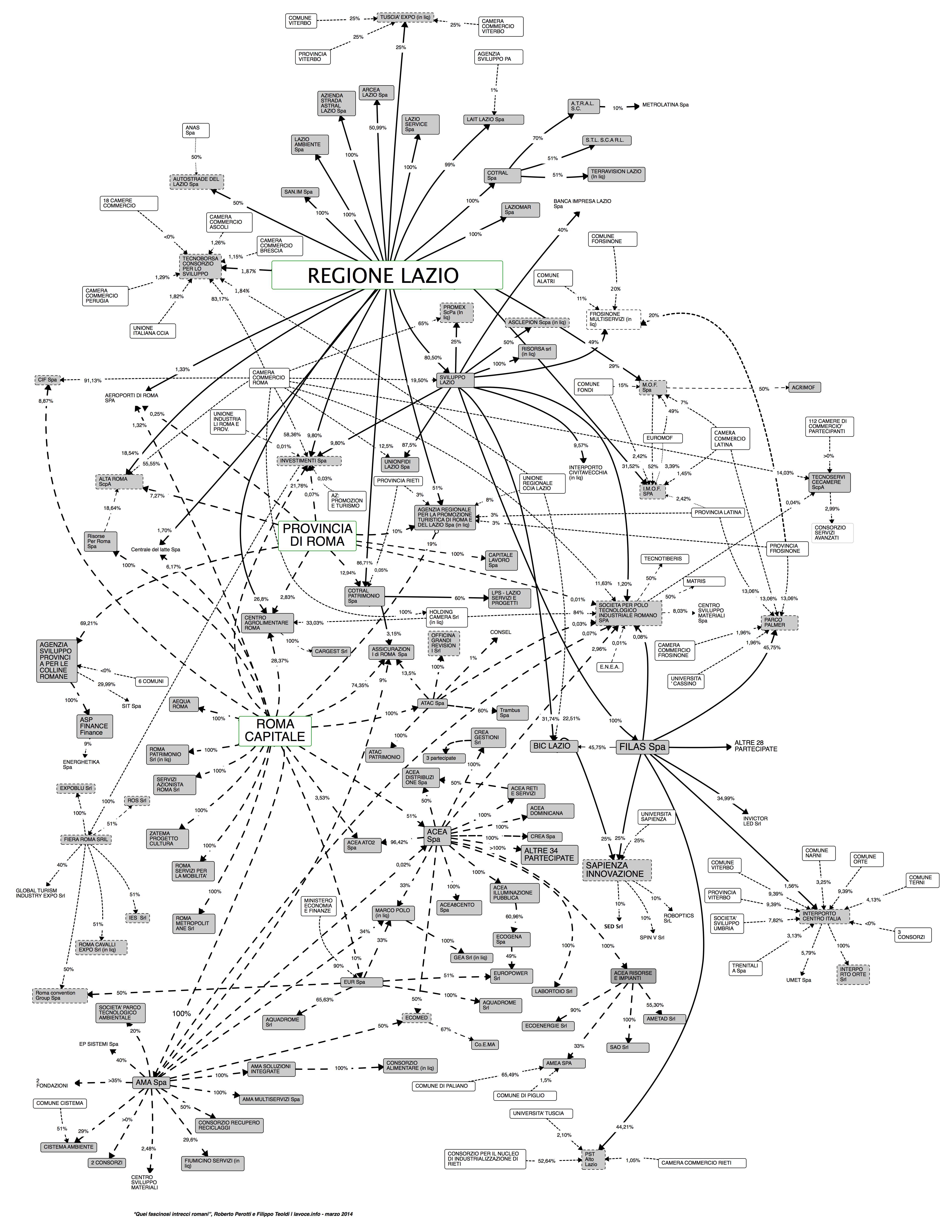 Il grafico sottostante mostra le partecipazioni della regione Lazio, della provincia di Roma, e di Roma capitale, e tutti i relativi incroci. I dati sottostanti sono stati ottenuti incrociando il database Amadeus con il bilancio di Sviluppo Lazio e i siti web di regione, provincia e comune. I dati sono aggiornati almeno al 31 dicembre 2012, e in parecchi casi a una data posteriore.