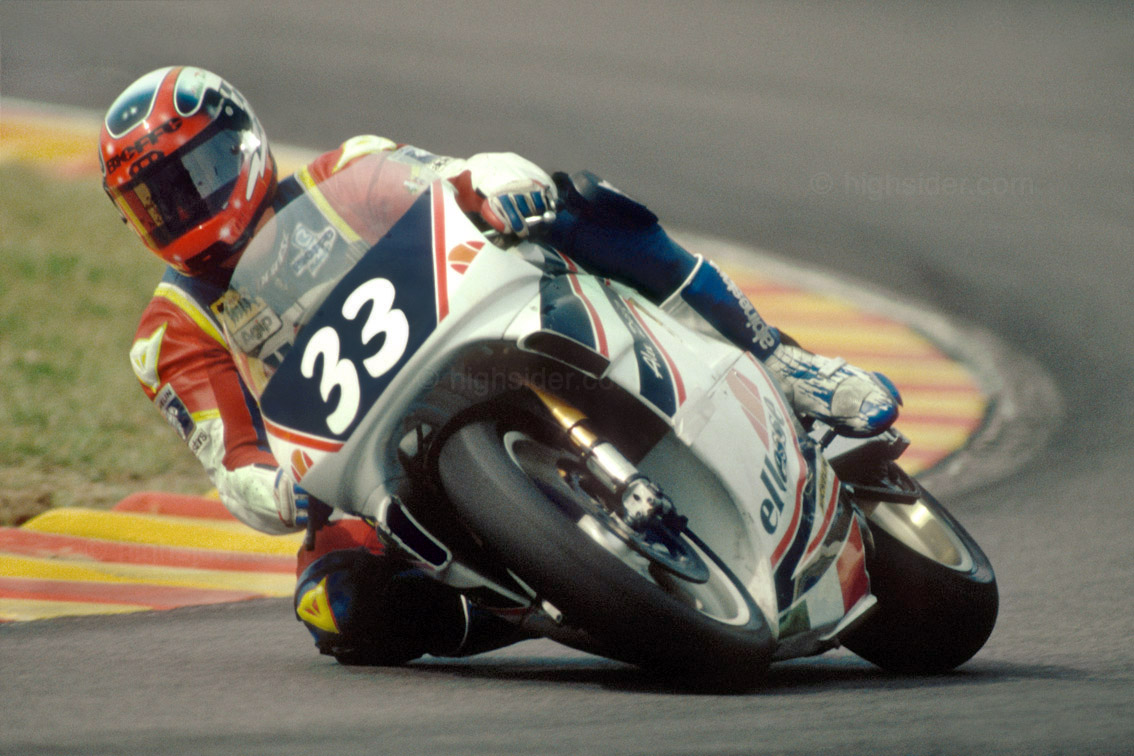 ragazzi io nel '90 ero collaudatore della Bimota Tesi1D ma il mio debutto mondiale è stato con la Paton nel '92 poi dal '93 al '97 conRoc-Yamaha. E in Germania quando ha avuto l'incidente Corrado io ero li. (anzi in ospedale) sono caduto nella stessa curva nelle libere del sabato.