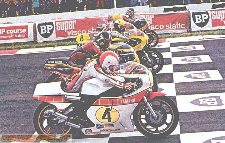 Dal pi? vicino al pi? lontano: Cecotto, Yamaha; Sheene, Suzuki;Roberts, Yamaha; Hennen, Suzuki. Sono indeciso sulla Yamaha n? 8, forse Katayama?