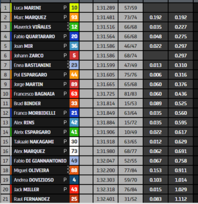 Pecco Bagnaia anche oggi non ha pensato troppo al tempo, ma ha badato al sodo. Il ducatista chiude decimo a 436 millesimi da Marini, ma con la bellezza di 83 giri all’attivo. Jack Miller, 20° ne ha messi a segno 84